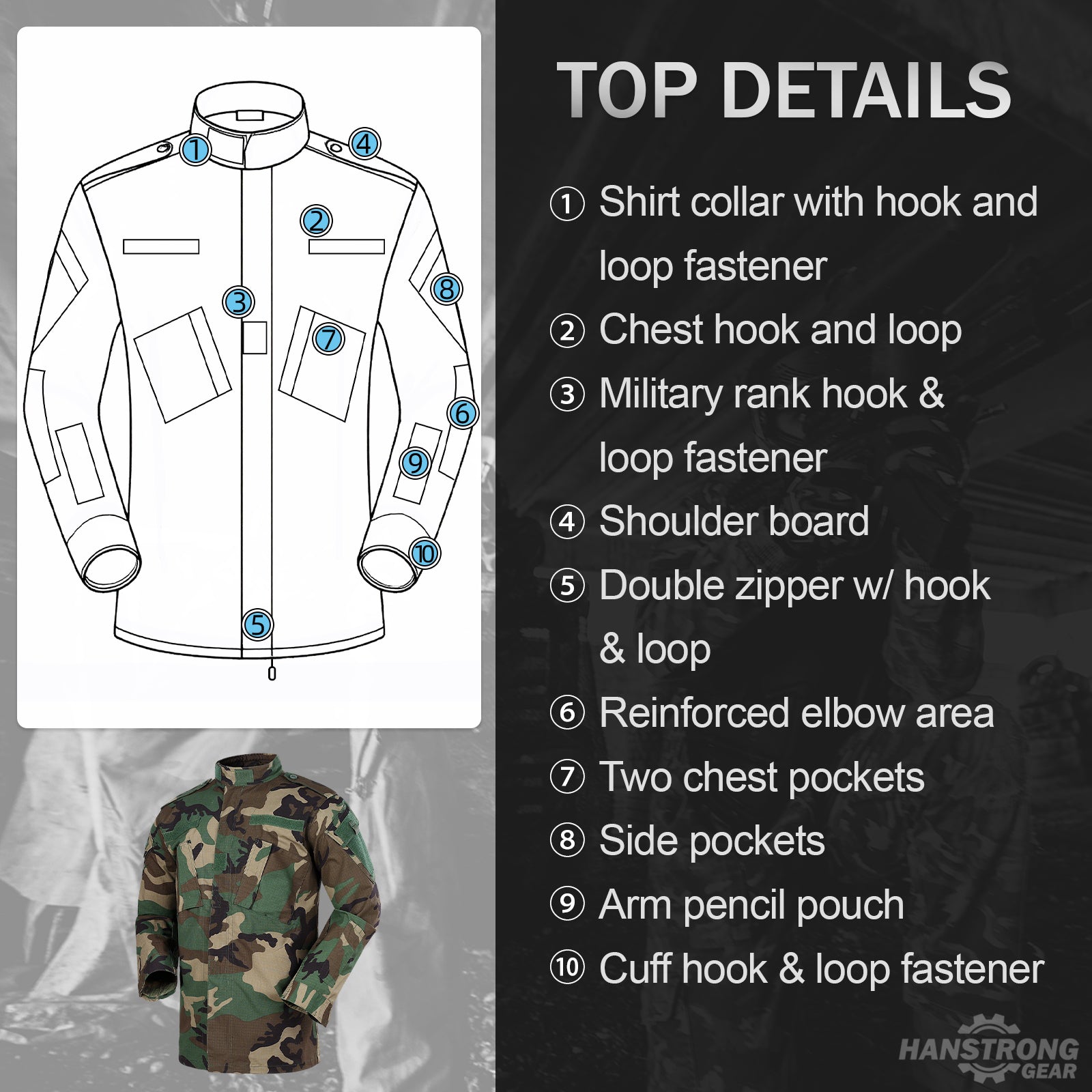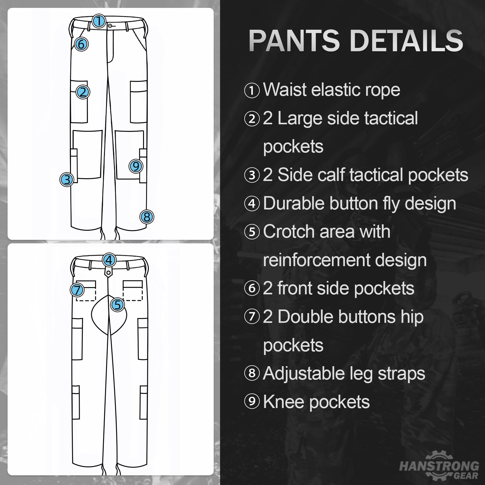 { Humanized Design Details } Multi-pocket design, reasonable distribution throughout the body, easy to store a variety of tools and items, to meet your daily carrying needs. Cuff/waist/bottom of pant leg can be arbitrarily adjusted to fit different body types, free movement without restraint, to meet the needs of high-intensity exercise. Chest hook and loop design, can attach tactical patches -